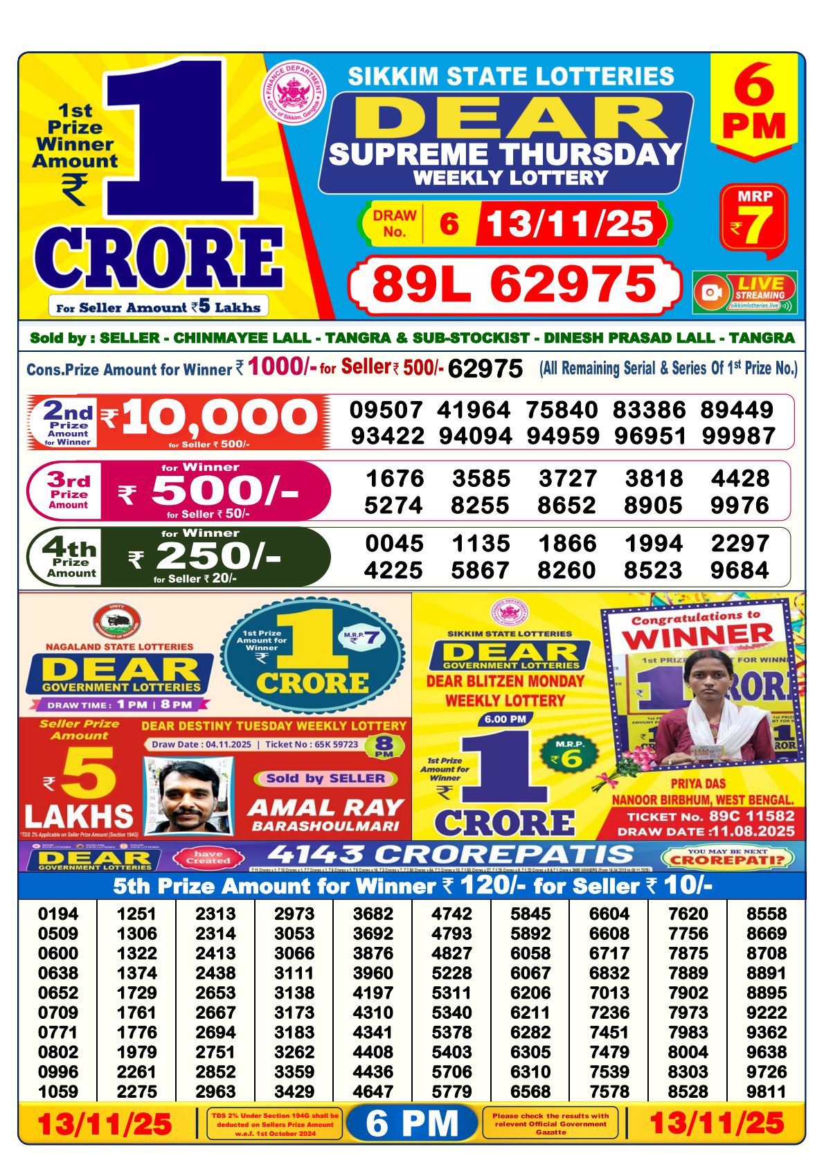 Nagaland State Lottery Sambad 6:00 PM Result The Nagaland State Lottery Sambad 6:00 PM Result is a daily lottery draw held by the Nagaland State Lottery. The results are declared at 6:00 PM and can be accessed online through official and authorized platforms. 1:00 PM 6:00 PM 8:00 PM Dear Evening 6:00 PM Tickets DayTicket NameMondayDear Desert Monday WeeklyTuesdayDear Wave Tuesday WeeklyWednesdayDear Hill Wednesday WeeklyThursdayDear Lake Thursday WeeklyFridayDear Mountain Friday WeeklySaturdayDear River Saturday WeeklySundayDear Sea Sunday Weekly Dear Day 6:00 PM Prize RankNo. of PrizesPrize Amount (in ₹)Super Prize Amount (in ₹)1199,00,0001,00,000Cons.2591,000500226009,0005003260005005042600025020526000012010